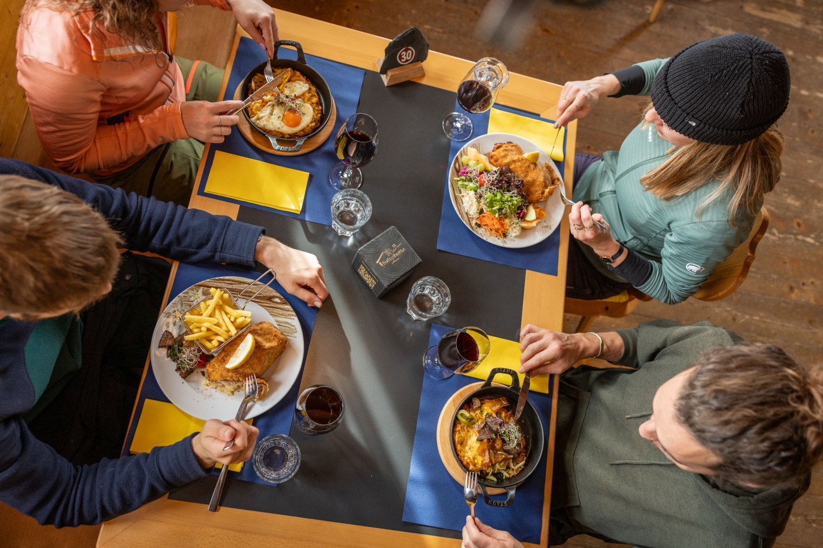 Wir wünschen dir «En Guata!» und freuen uns, dich bei uns kulinarisch verwöhnen zu dürfen. Lass dich von unserer Speisekarte inspirieren. Das passende Getränk egal ob Tee, Kaffee, Skiwasser, Hüttenkaffee, Mineralwasser, Bier, Bündner Weine oder einem feinen Röteli findest du in unserer Getränkekarte oder natürlich bei uns auf der Sattelhütte.